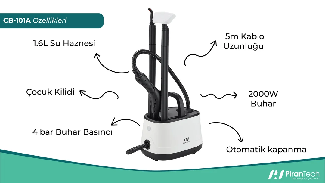 Pirantech CB-101A, güçlü buhar teknolojisi ve geniş aksesuar setiyle evinizin her köşesinde derinlemesine temizlik sağlar. 2000W motor gücü, 4 bar buhar basıncı ve 110 derece buhar sıcaklığıyla zorlu kirleri kolayca söker. 1.6 litrelik geniş su tankı sayesinde 35-50 dakika boyunca kesintisiz buhar üretir. Kimyasal gerektirmeden yalnızca su ile çalışarak hijyenik ve çevre dostu temizlik imkânı sunar.
