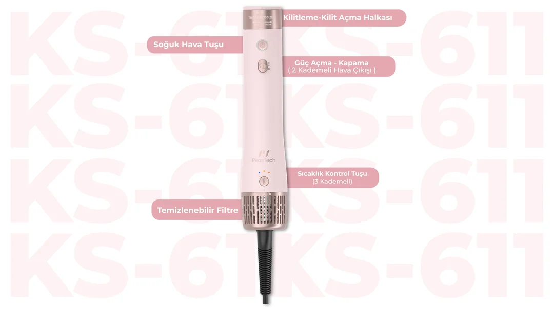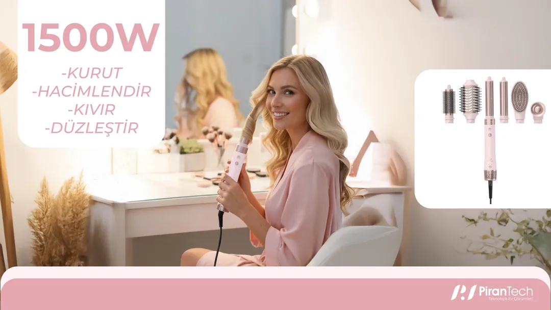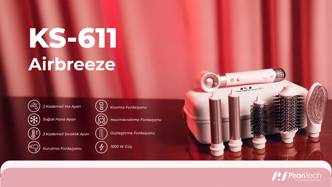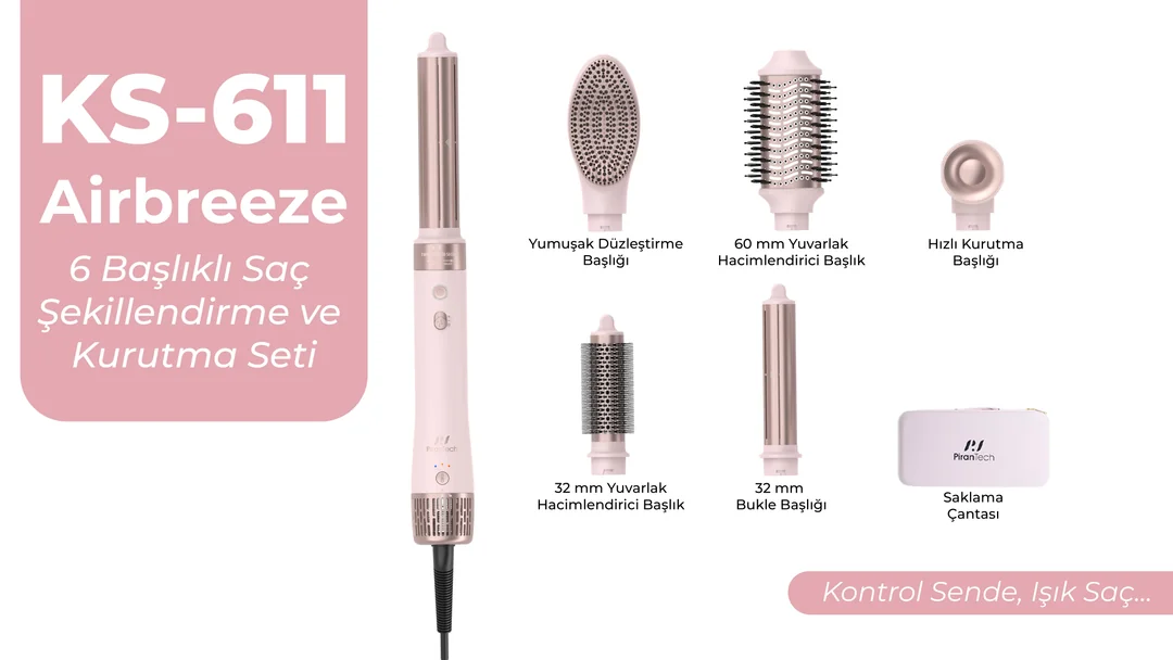 Tek bir cihazla saç kurutma ve profesyonel şekillendirme Pirantech KS-611 Airbreeze, 1500W gücü, 6 farklı başlığı ve 3 kademeli sıcaklık kontrolü ile evde kuaför kalitesinde sonuçlar sunar. Doğal bukleler, pürüzsüz düz saçlar veya dolgun hacimli stiller için ihtiyacınız olan her şey bu sette Soğuk hava fonksiyonu ve güvenli başlık kilidi ile Devamını Göster